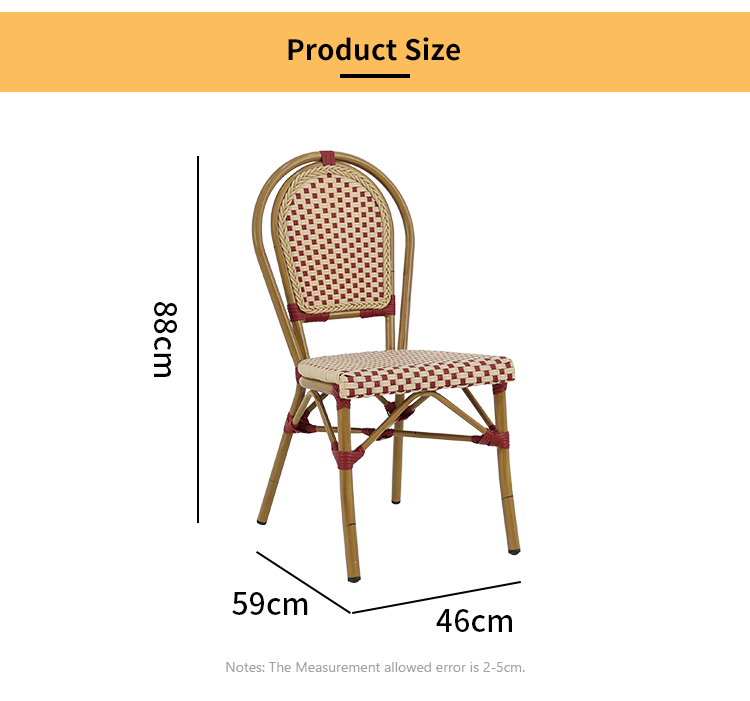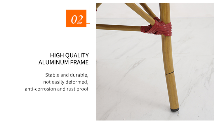 This French-style rattan coffee chair features a high-quality aluminum alloy frame, making it lightweight and sturdy. It's designed for various outdoor settings, including coffee shops, gardens, and patios. Its unique French romantic style and exquisite rattan craftsmanship offer both elegance and comfort. Whether in bright sunshine or light rain, it withstands harsh weather conditions, maintaining its beauty and durability for a long time. It will give your outdoor space a unique charm and enhance your customers' dining experience.