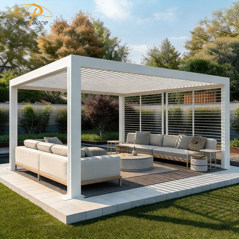 The BP8711 outdoor gazebo features a sturdy frame constructed from high-strength aluminum alloy, making it wind-resistant, durable, and resistant to corrosion and rust, easily withstanding harsh outdoor conditions. The adjustable louver design allows for easy switching between sunshade and ventilation, blocking strong sunlight for cooling and providing ample airflow and natural light when open. This product is suitable for various settings such as patios, terraces, and gardens, and requires minimal maintenance – simply wipe it clean. Enjoy a comfortable and private space outdoors anytime, anywhere, and savor your leisure time.