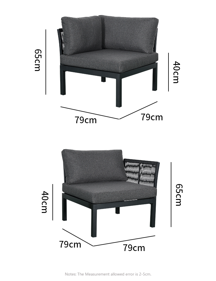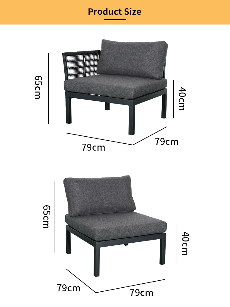 Single Sofa Frame:W70*D70*H32cm Rattan Aluminium Base:W75*D38*H20cm Seat Cushion:72*72*12cm Back Cushion:75*38*20cm |