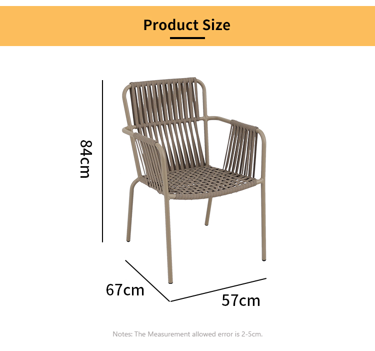 This outdoor aluminum alloy chair features a sturdy aluminum frame, comfortable armrests and backrests, and a simple yet stylish design. The seat, backrest, and armrests all utilize exquisite rope weaving, providing a unique tactile feel and elegant visual appeal. Whether for leisure time or social gatherings, it adds comfort and sophistication to your outdoor space. Sturdy, durable, and comfortable, it makes every moment outdoors truly enjoyable.
