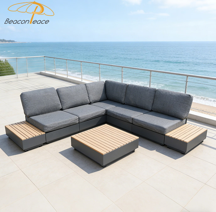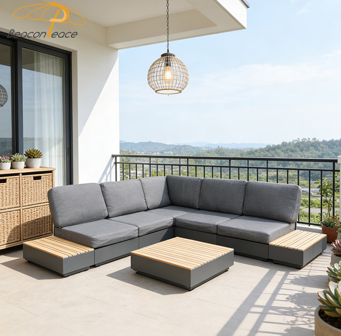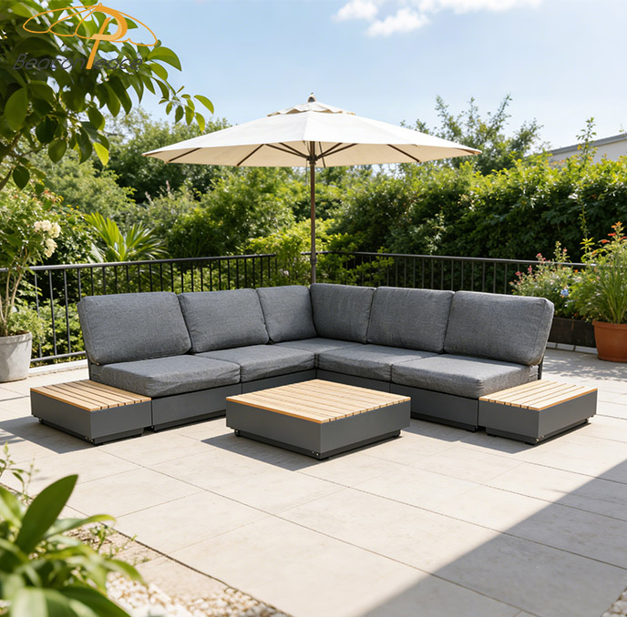 This BP8540 outdoor sectional sofa set is crafted from a sturdy aluminum frame and durable wood-plastic composite (WPC) accents. The aluminum frame offers exceptional rust resistance, lightweight stability, and long-lasting durability, while the WPC side tables and coffee table top mimic natural wood grain with superior weather and water resistance. The thick, water-resistant cushions provide plush comfort, making this modular set ideal for patios, balconies, or gardens, blending modern minimalist design with versatile outdoor functionality.
